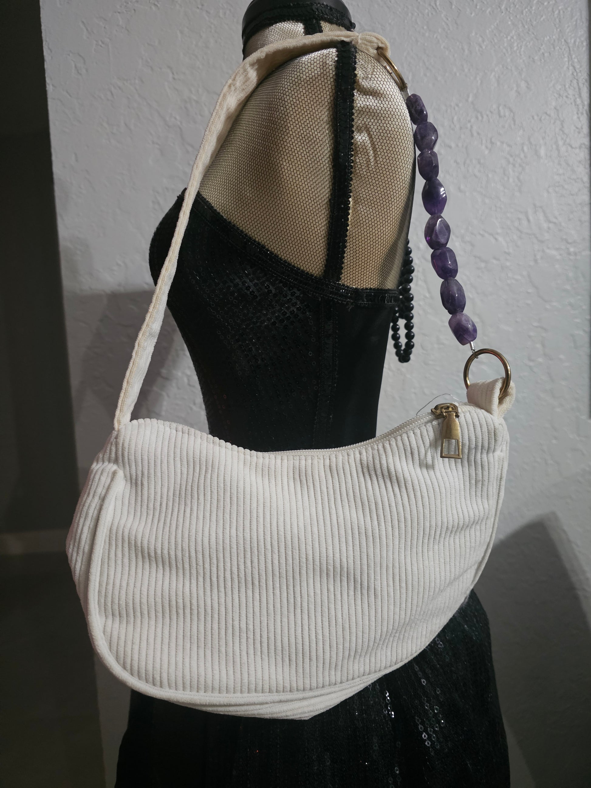 🌙 White Corduroy Sun & Moon Purse with Genuine Amethyst Strap 🌙