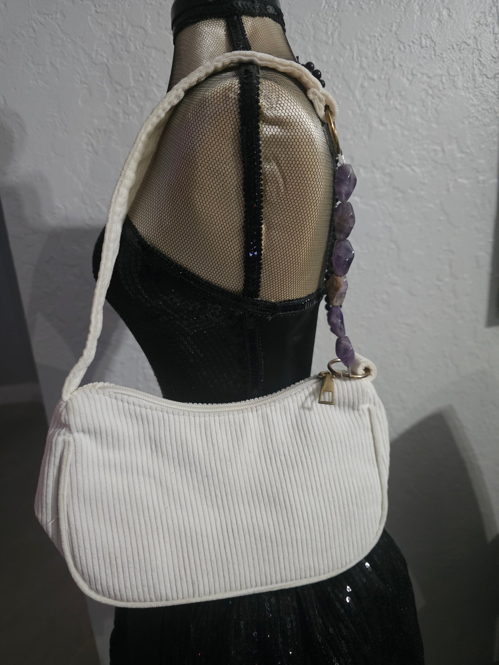 🔮 White Corduroy “Raise Your Vibration” Purse with Genuine Amethyst Strap 🔮